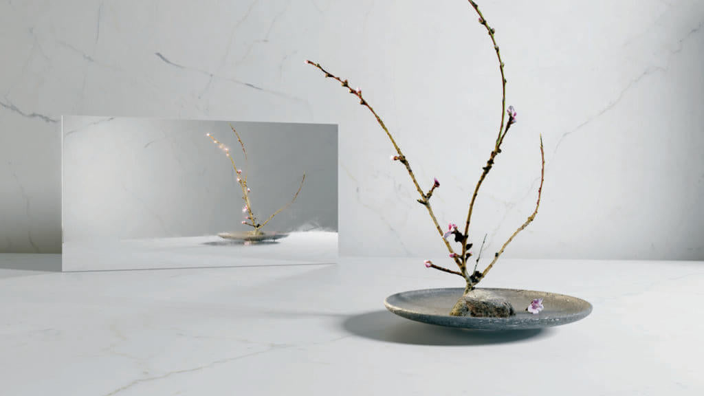 A pearl-white backdrop crisscrossed with crackling dark grey veins that rush over the illuminated shelllike surface with its blushed undertones, imprinting a dynamic dimension heightened by the Honed finish in a unique design that is truly innovative.