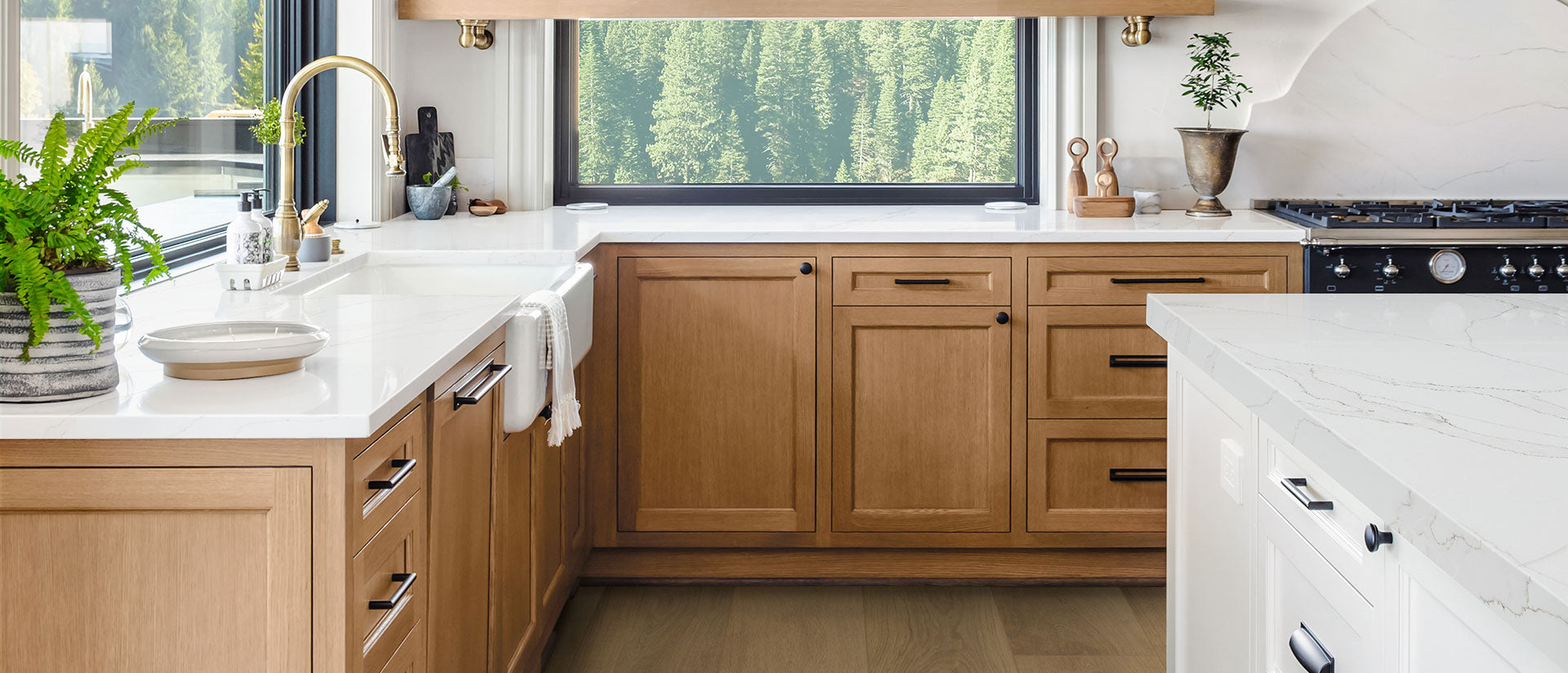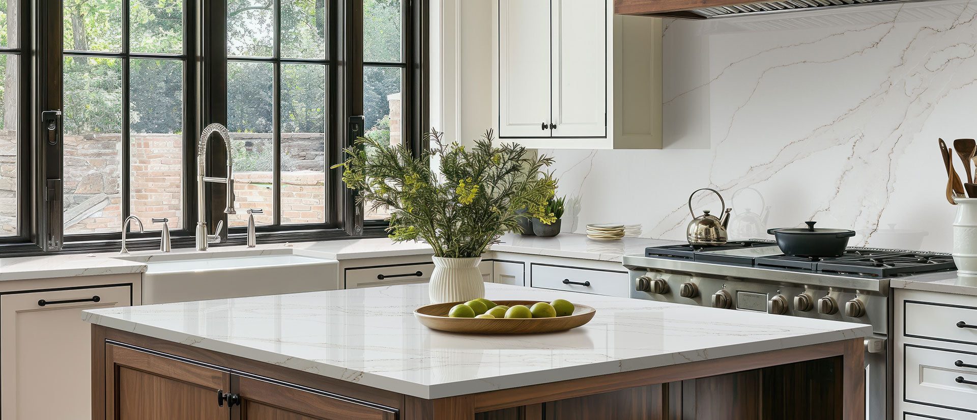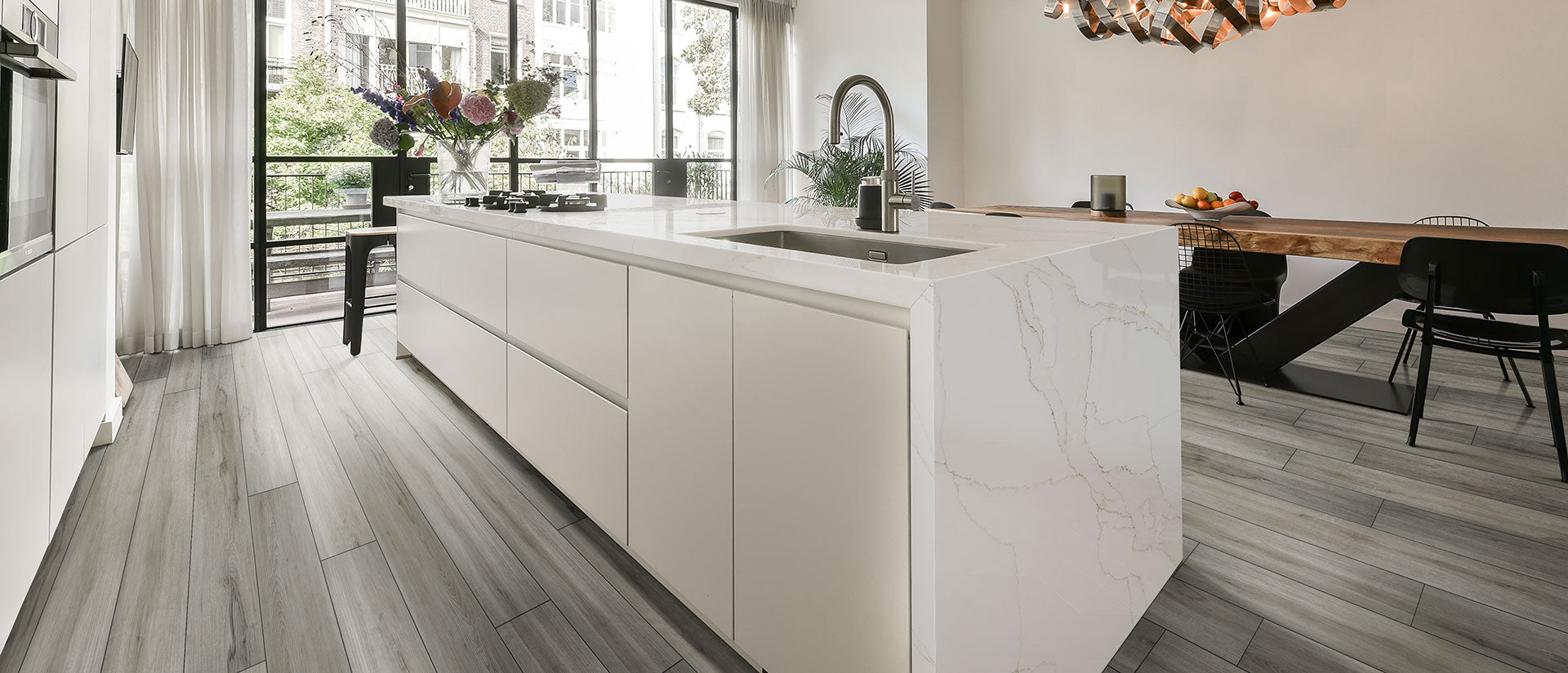 With its creamy soft white landscape and gentle strokes of long brown and golden veining, Calacatta Izaro™ Premium Natural Quartz enhances your space with exceptional beauty reminiscent of nature itself. A modern take on an enduring classic, this statement quartz gives your space a bright, fresh ambiance that sets the stage for any décor. Use Calacatta Izaro™ Quartz on countertops, waterfall islands, accent walls, showers, and other features where the look of marble is desired, and the ease of quartz is preferred. In residential and commercial spaces, Calacatta Izaro™ Quartz is a natural choice for a durable, low-maintenance, stain-resistant surface. Choose 2 cm or 3 cm bookmatched slabs for maximum design and installation flexibility.