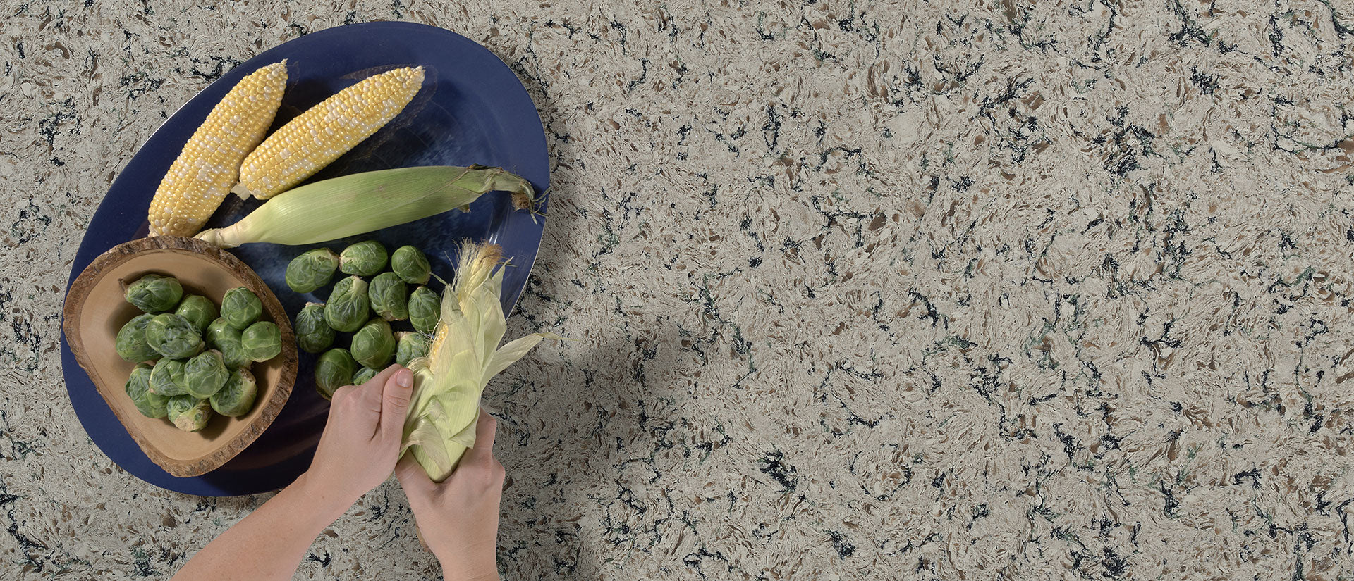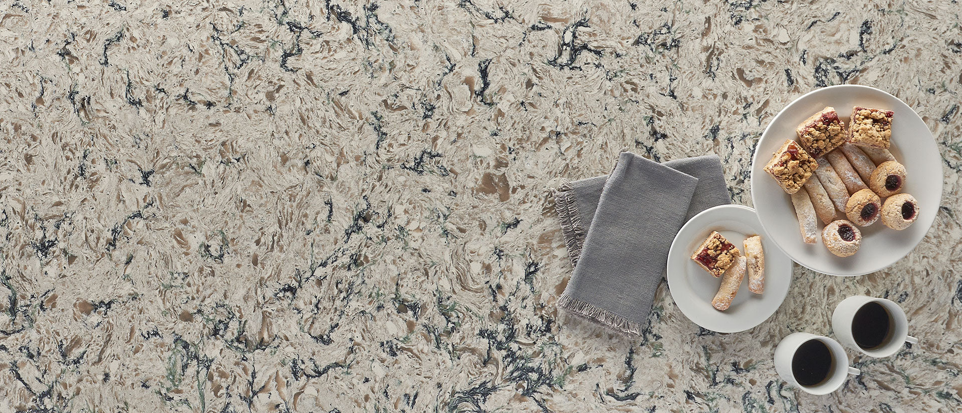 Pacific Salt Quartz is reminiscent of a high movement natural stone, featuring dark gray and tan veins and swirls contras...